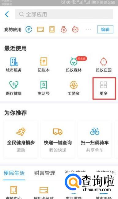 首先,我们打开我们手机上的支付宝,然后我们点击更多;