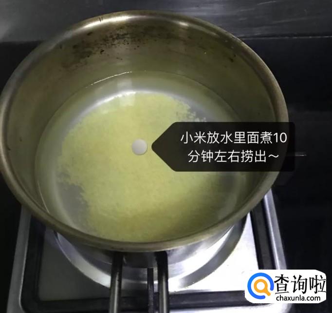 然后锅中放入适量的清水,待水烧开,倒入小米在锅中煮十分钟左右捞出,如下图所示。