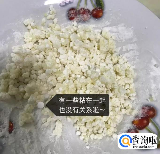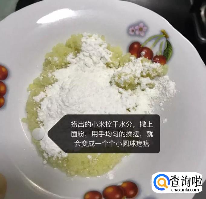 接着将捞出的小米控干,加入面粉用手指揉匀,如下图所示。