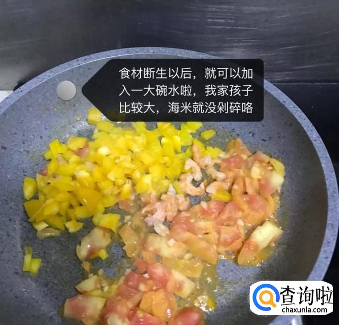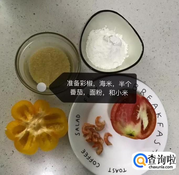 首先准备好所有要用到的食材,如下图所示。小贴士:彩椒半个,海米15克,半个番茄,面粉50克,小米50克。
