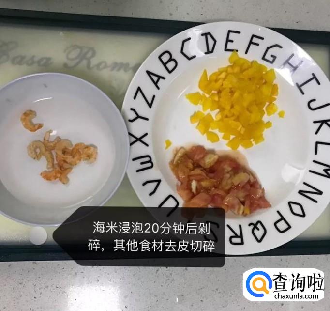 接着将海米浸泡20分钟后剁碎,其他食材去皮切碎,如下图所示。