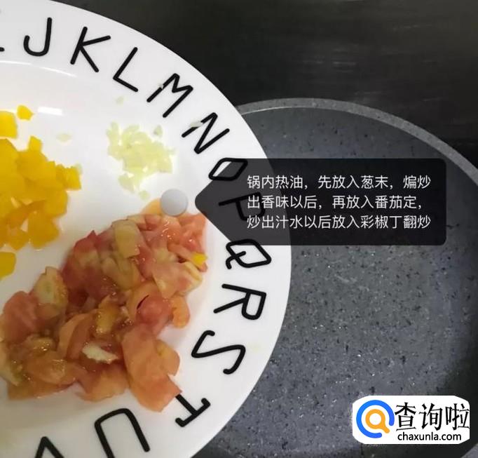 然后锅中放入适量的食用油,待油冒烟,先放入葱末爆香,倒入番茄和甜椒丁翻炒两分钟,如下图所示。