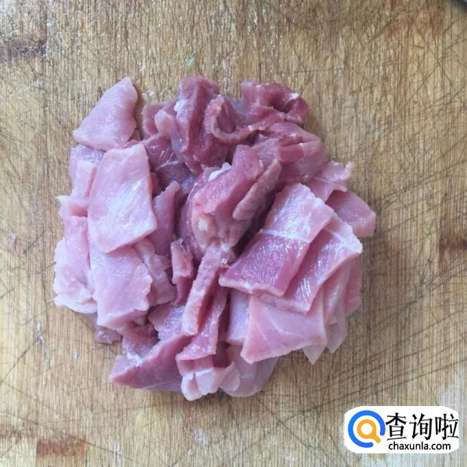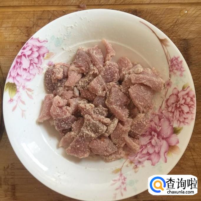 然后把瘦肉切成薄片并用适量的地瓜粉裹一下。