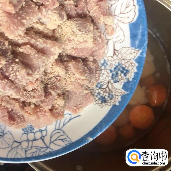 接着把裹好的瘦肉倒入锅中煮五分钟。