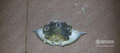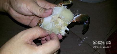 然后把螃蟹外壳掰开,把背壳扔掉,因为内脏和蟹心都在上面,如果有蟹黄的,就把蟹壳中间的三角地带给去掉,没有蟹黄的,就全扔掉背壳吧,都没肉的。