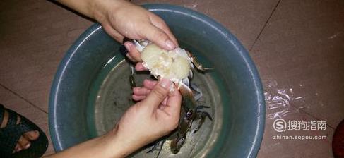 去掉蟹嘴,再去掉蟹腮,并用水冲洗干净。