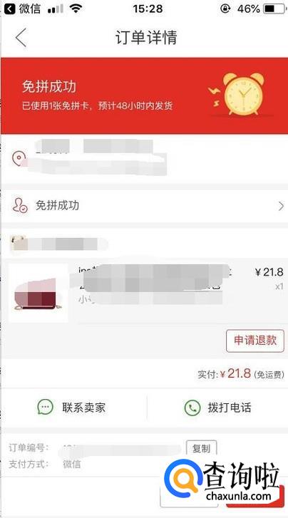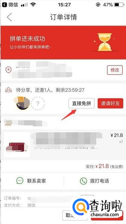 最后我们就会看到上面已经提示免拼成功,等待商家发货了。