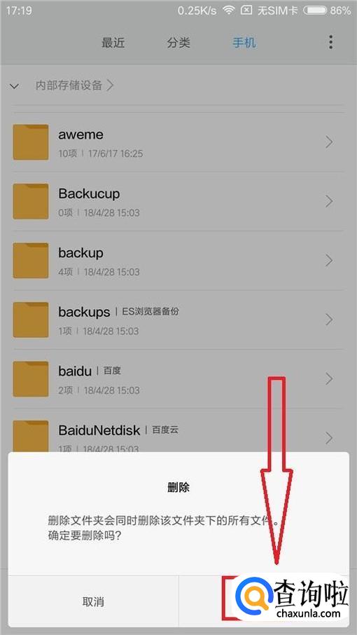 再点击右下角的“删除”按钮,即可清理手机中没用的文件夹。