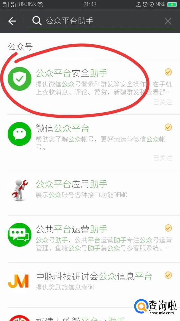 在搜索框中搜索“公众平台助手”,点击第一个搜索结果,关注公众号进入主页面。