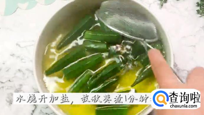 烧一锅水,待水开后加盐,将秋葵放进去煮1分钟,然后捞出来装在碗中。