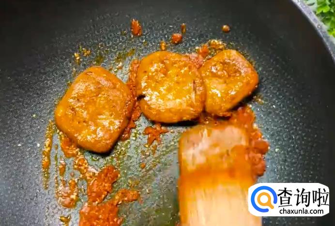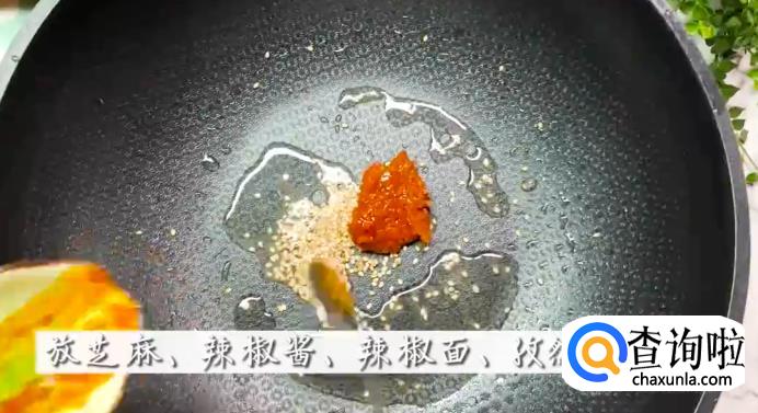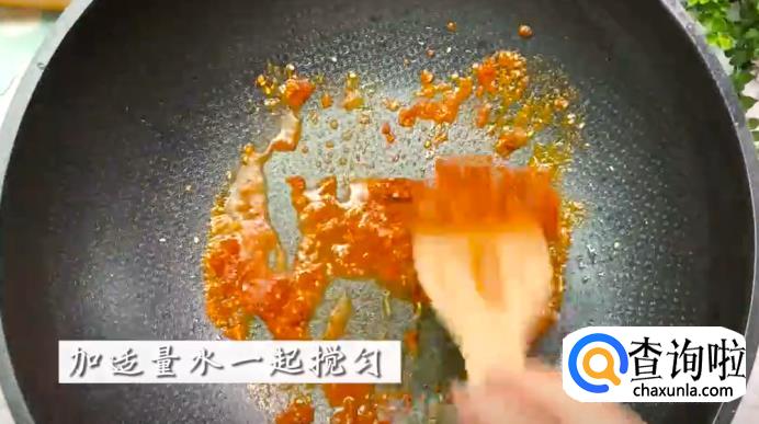 然后在锅中加入芝麻、辣椒酱、辣椒面和孜然粉翻炒几下,再倒入适量水,一起搅拌均匀。