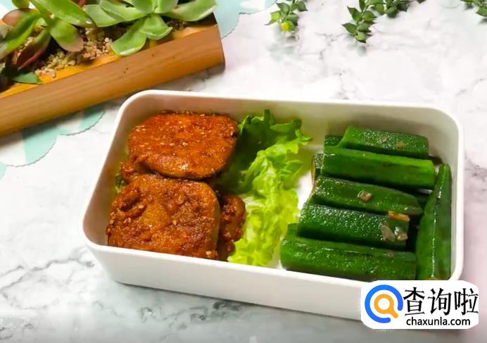 最后,把香干、秋葵装进便当盒中,还可以根据个人喜好进行摆盘。这道香煎豆腐便当就完成了。