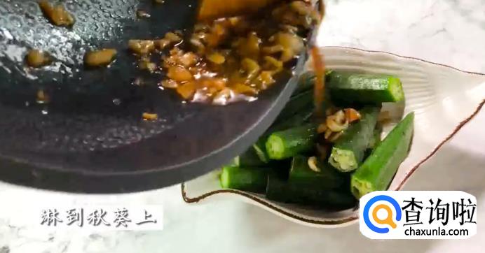 将煮好的酱汁淋到秋葵上,然后放在一旁。