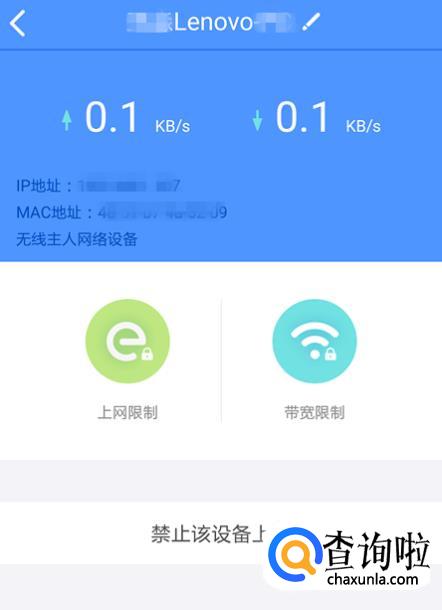 点击了以后,就进入到蹭网的设备的管理界面。在该界面下方显示“禁止该设备上网”,这样就成功的把蹭网的踢掉了。
