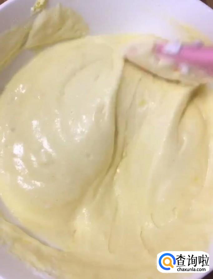 然后我们将打发好的蛋清分三次放入蛋黄糊中,翻拌均匀