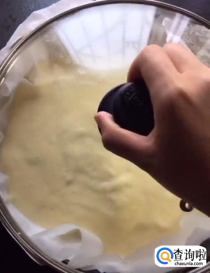 平底锅放上一张吸油纸,倒入面糊,盖上锅中,小火焖15分钟