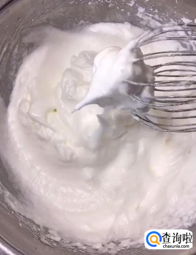 接着我们将蛋清加入15g白糖,用电动打蛋器打发至定型
