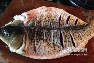将买来的鱼剥开肚腹,清理干净,然后在鱼面上用刀划几刀,这样更容易入味。