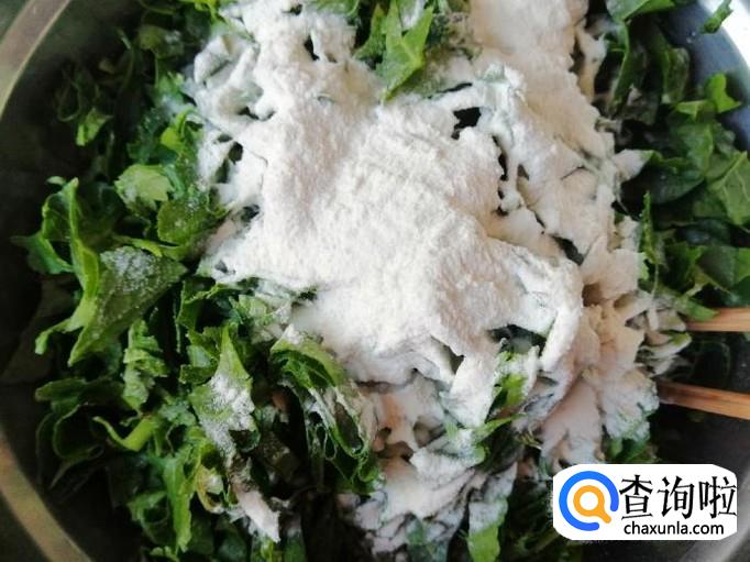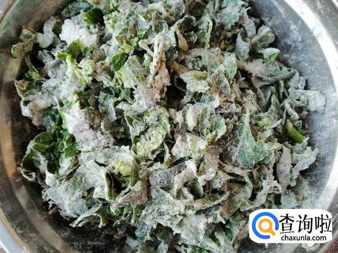 把切好的萝卜叶子,放入大一点的容器中,加入适量食盐,用筷子搅拌均匀,然后放入适量面粉,搅拌均匀,让所有叶子上都裹满面粉就可以了。