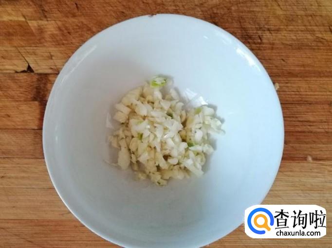 取适量大蒜剥皮,用清水把大蒜洗净,用刀切掉两头,用刀背把大蒜拍扁,然后切成蒜末,盛入碗中待用。