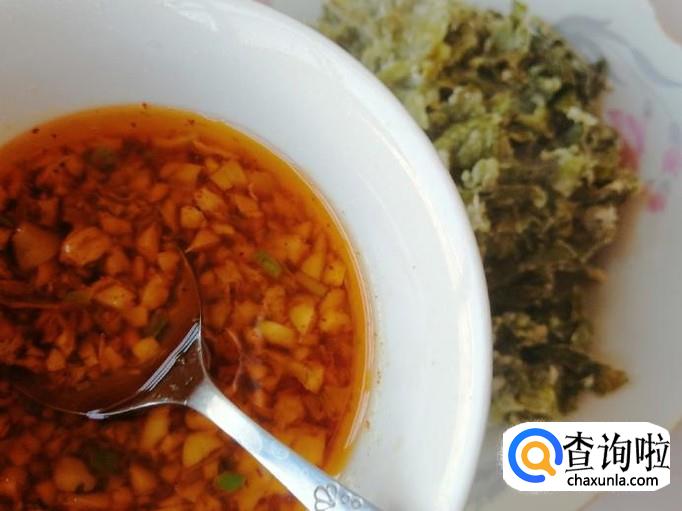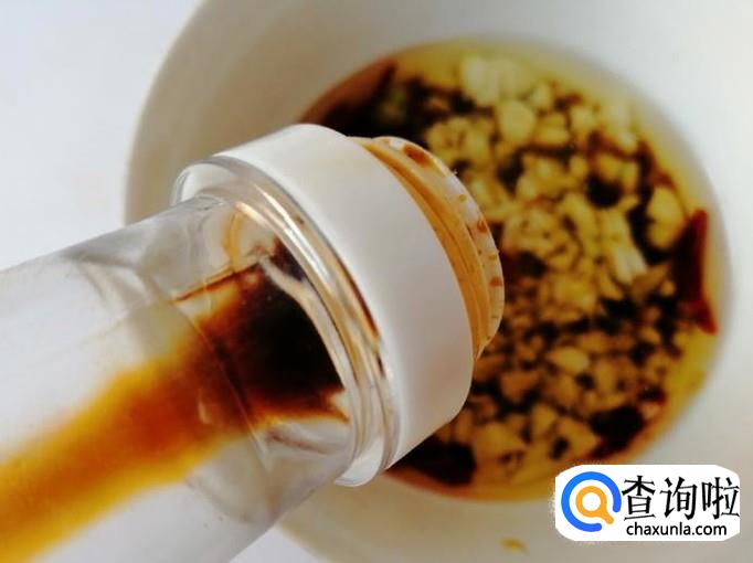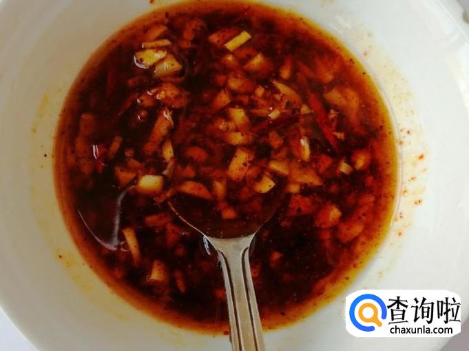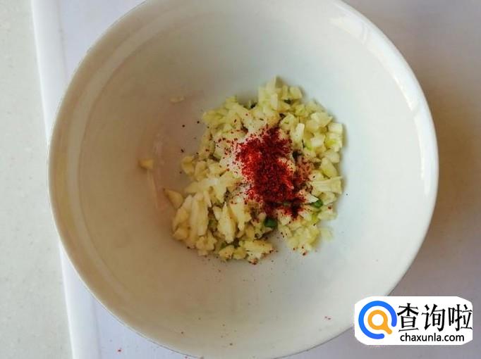 这一步我们先调好汁,蒜泥和辣椒面放入碗中,放入适量食盐,炒锅烧热油,油热后浇在蒜泥和辣椒面上,碗中加入适量生抽和食醋,用勺子搅拌均匀就可以了。