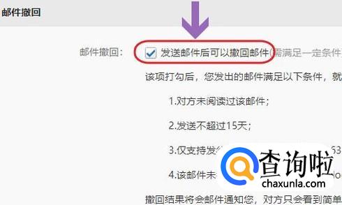 这是页面就会切换至邮箱的设置窗口,我往下拉动页面找到其中的“邮件撤回”,然后勾选下面的“发送邮件后可以撤回邮件”,这个是前提条件,务必勾选才能有效的收回邮件哦;