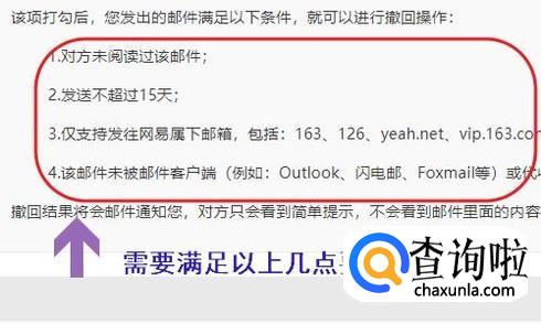 首先,网易邮箱是支持邮件撤回的,不过需要满足几点条件才行,比如说对方未读邮件内容、发送不超过15天、以及邮件未被第三方邮件客户端代收,如图所示...