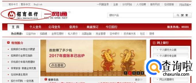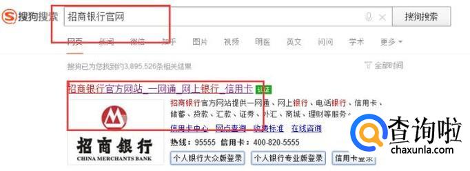 在浏览器中输入【招商银行官网】,点击具有官网标志的链接,如下图所示: