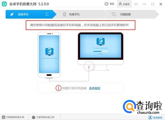 运行软件,刚开始界面上会提示需要连接手机才可以,但是手机需要获取root权限才可以连接上。