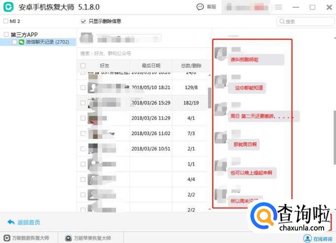 这时候开始扫描数据,在扫描的时候要耐心等待,直到扫描结束。扫描完成后,界面上显示聊天记录,点击只显示已删除的,显示红色的字体就是表示删除的聊天记录。