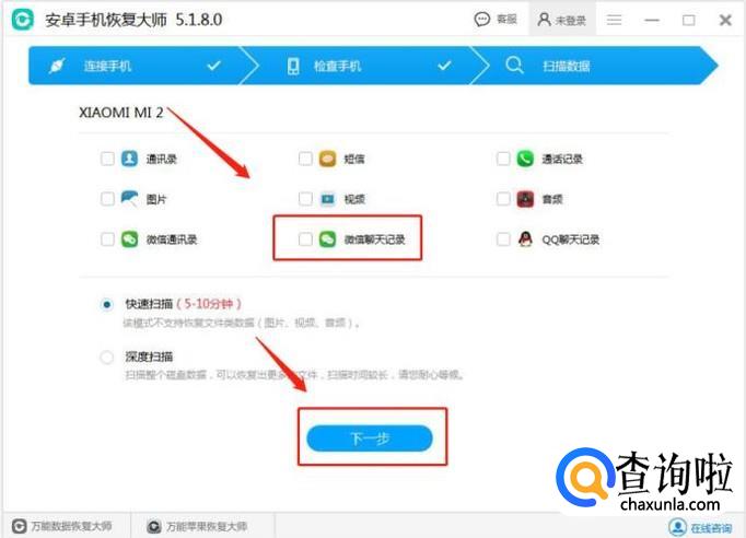 连接上手机后,在软件上选择微信聊天记录,进入下一步。