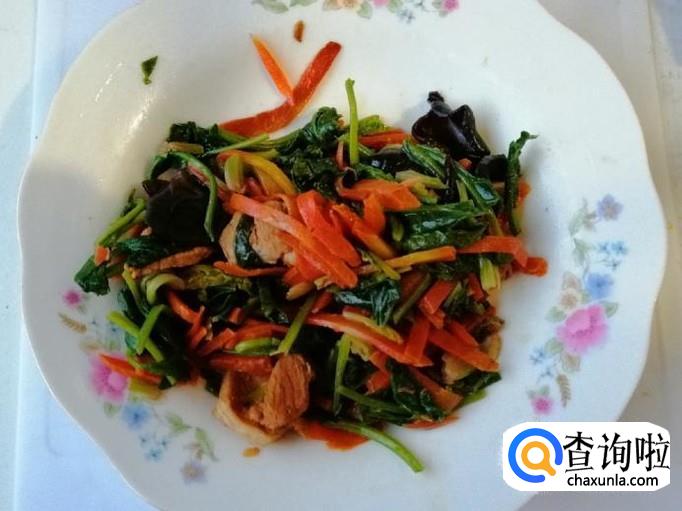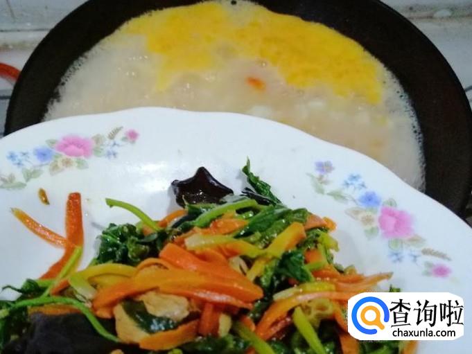 准备好家里的剩菜,我这里选用的是,中午没吃完的胡萝卜菠菜木耳炒肉,一会疙瘩汤快熟的时候,加进去就可以了。