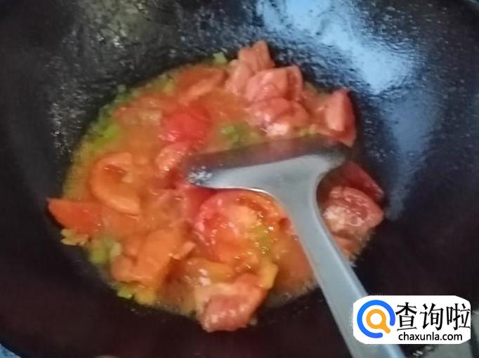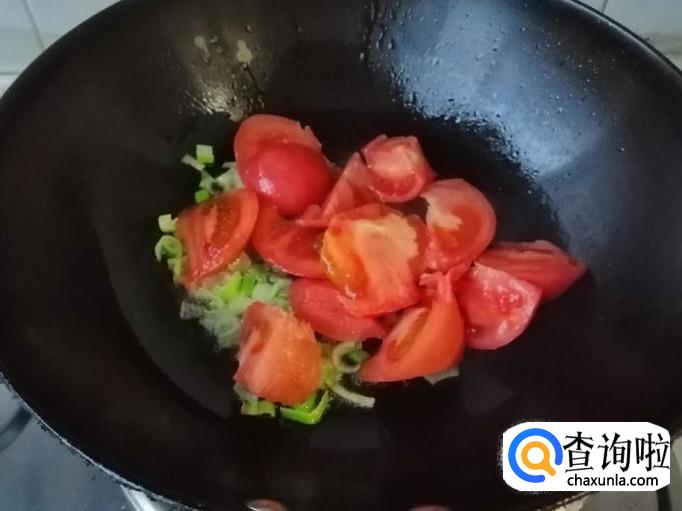 炒锅放油,油热后放入葱花炝锅,然后放入西红柿,用铲子翻炒均匀,炒至西红柿出汁,加入适量清水。