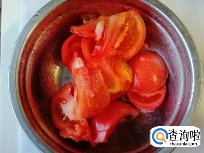 准备一个新鲜的大西红柿,用清水把西红柿洗净,然后把西红柿切块待用。不喜欢西红柿皮的,可以把洗净的西红柿,用开水烫一下去皮。