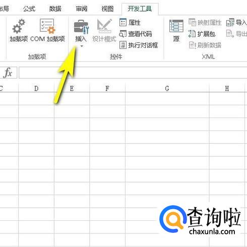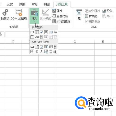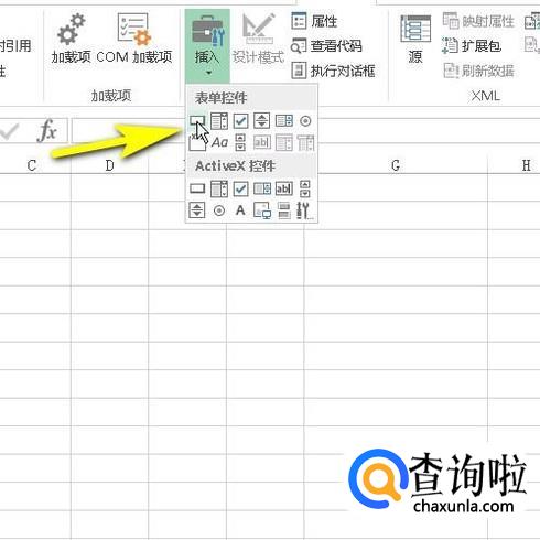 在下面展开的各个功能组中,再点控件组中的插入。弹出下拉菜单。