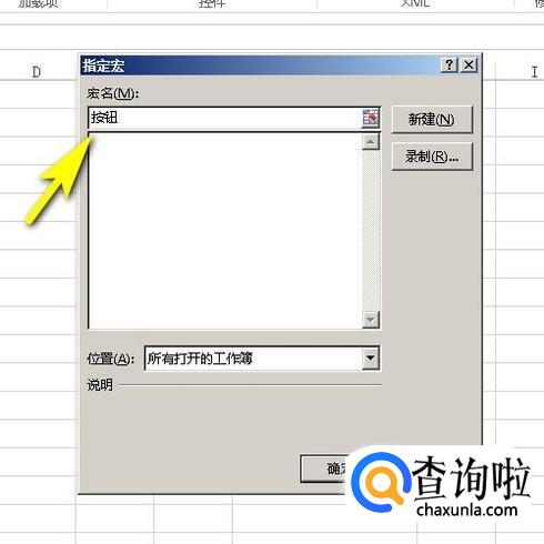 鼠标就变成一个+字样,鼠标点表格,弹出设置按钮的对话框,接着,在宏名这里输入按钮名称。点击确定。