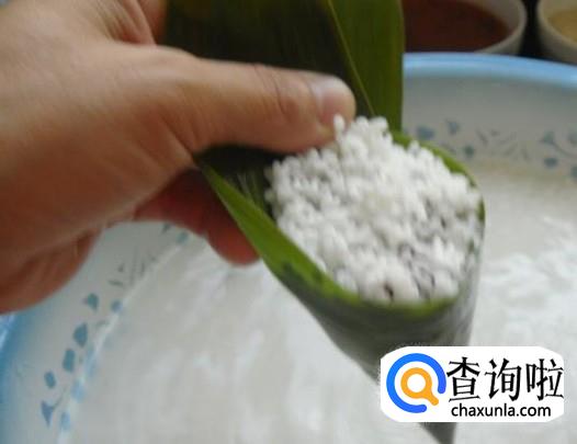 然后把煮好的粽叶折成斗型,然后把泡好的糯米放到粽叶里面,然后把粽子叶折起来包裹一下,然后用绳子固定。