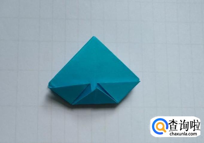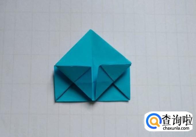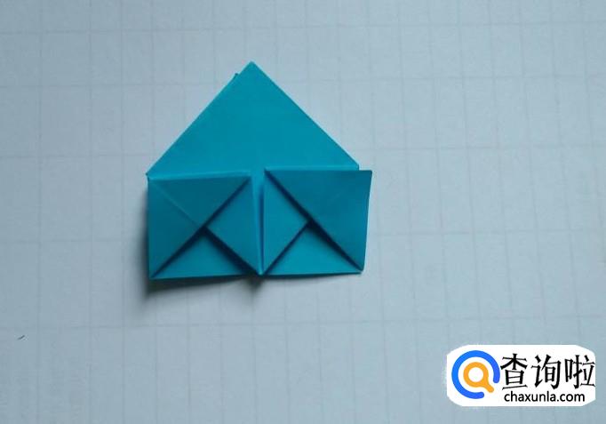 先将折纸上层的三角形的两面分别向上折(第一图),然后把下层同样也折向中心线(第二图)。