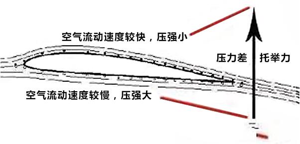 飞机之所以能够飞上天空,关键点之一就是机翼的特殊结构。飞机的机翼横截面一般前端圆钝、后端尖锐,上表面拱起、下表面较平。当等质量空气同时通过机翼上表面和下表面时,会在机翼上下方形成不同流速。空气通过机翼上表面时流速大,压强较小;通过下表面时流速较小,压强大,因而此时飞机会有一个向上的合力,即向上的升力,由于升力的存在,使得飞机可以离开地面,在空中飞行。飞机飞行速度越快、机翼面积越大,所产生的升力就越大。
