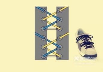 将两条不同颜色的鞋带准备好,一端在内侧打结,另一端按照以往的方法来穿,之后跳一个孔穿进去,另一条鞋带用同样的方法来穿,使其呈现出十字交叉的形状即可,适用于鞋带比较长的球鞋。