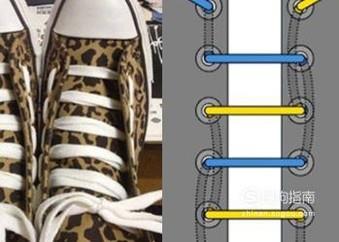 这种系带方式适用于双色鞋带,将两条鞋带分别从左侧穿到右侧,再从右侧穿回左侧,反复进行再系带即可,能让鞋子看起来立体很多。