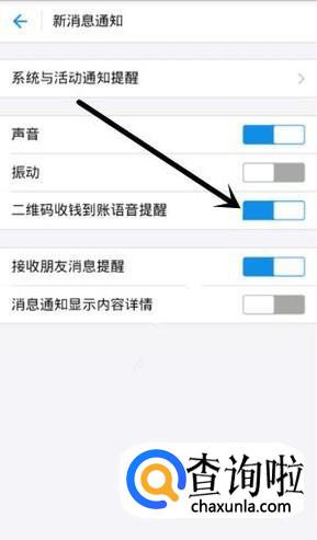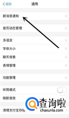 然后在通用页面点击 新消息通知,进入之后将 二维码收款到账语音提示 关闭即可