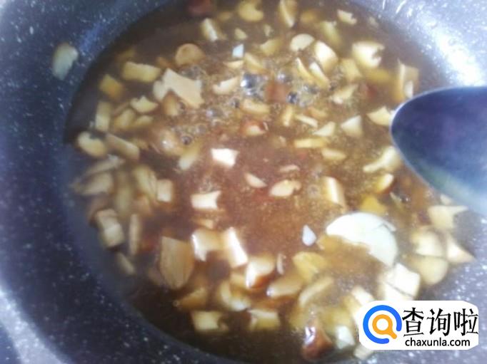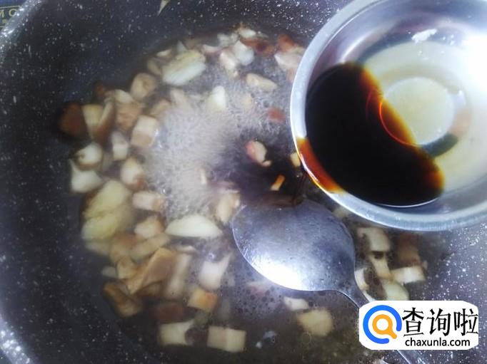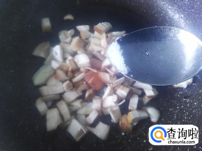再开火,锅里还剩有油,直接下蒜米进去爆出味来,然后下香菇丁进去。