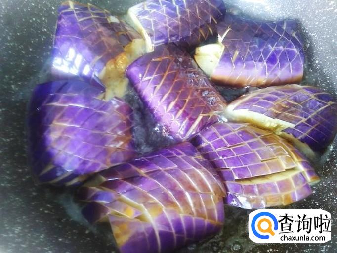 然后摆茄瓜到锅里,瓜皮那面向锅底,盖上锅盖用中火炸4分钟左右。