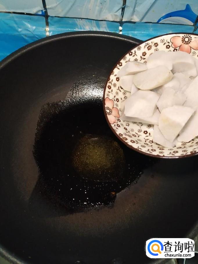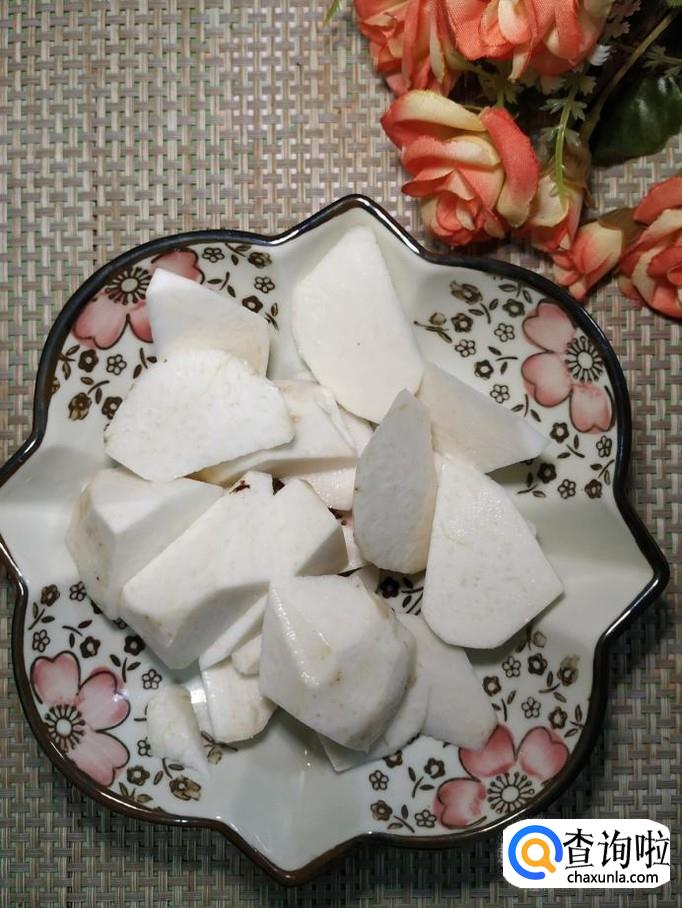 准备适量芋头,削去外皮,切成滚刀块,注意,在处理的过程要保护好手部,芋头的粘液一旦接触好手部,会刺激皮肤发痒。