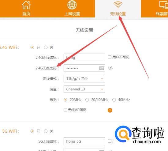 点击无线设置;在下面的WIFI处修改密码;注意:无线WIFI密码尽量不要使用类似12345678这样简单的密码,可以使用字母加数字的方式,无线名称不要改成中文。
