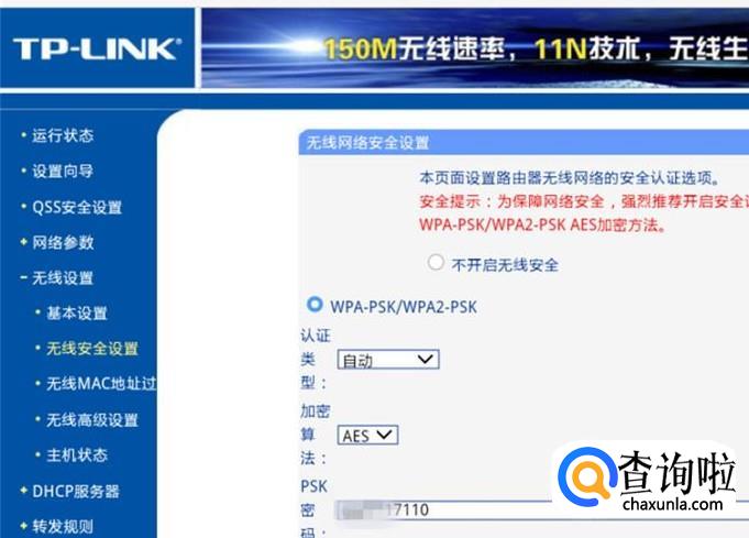接着就会进入路由器的管理界面,点击左边的“无线设置”—“无线安全设置”,可以看到右边的“PSK密码”,这就是路由器的无线密码。