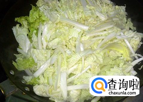 然后放白菜进去,加适量的盐大火翻炒至然后,盖上锅盖焗2分钟左右就可以出锅了。