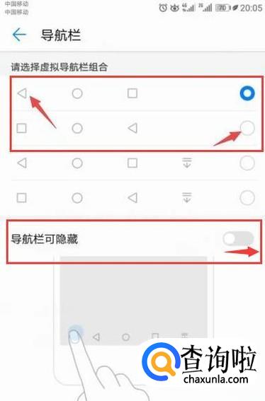 弹出的界面,我们可以看到系统默认的返回键是在左边的,选择喜欢的哪一个,这里我们可以点击第二个选项。下方导航栏可隐藏这里,点击一下把开关打开。