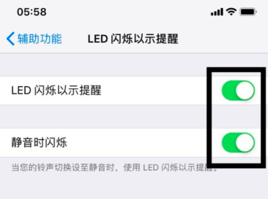 6、还可以将两个按钮都打开,这样在静音的时候手机前置呼吸灯也会闪烁。